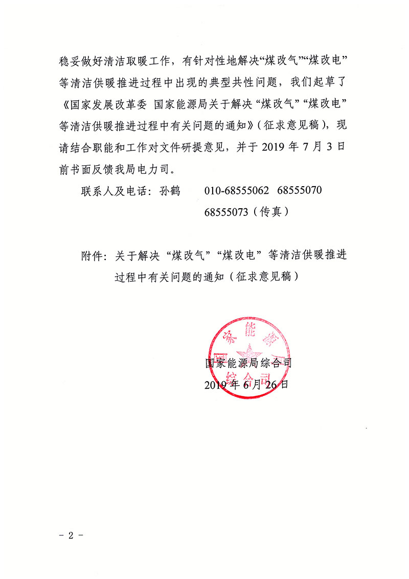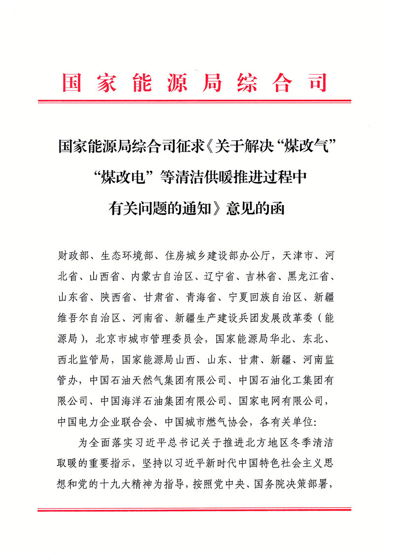 2019年7月3日,国家能源局发布征求《关于解决“煤改气”“煤改电”等清洁供暖推进过程中有关问题的通知》意见的函。